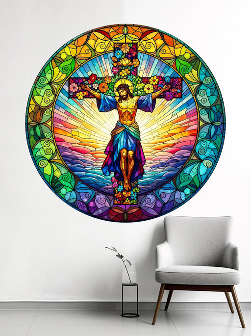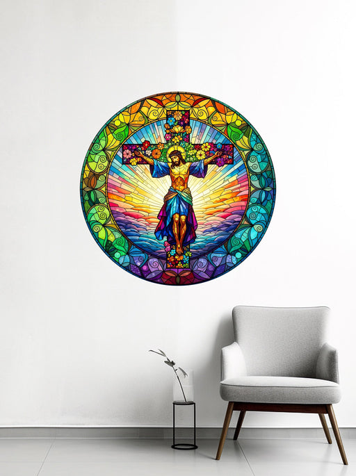 Zobrazit celý detailDřevěný barevný nástěnný obraz - Ježíš na kříži, kruh, skleněný