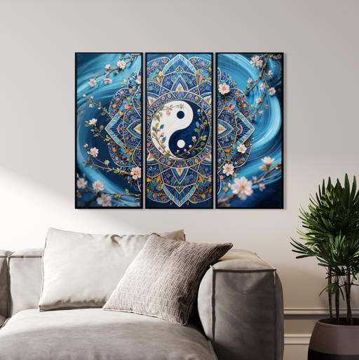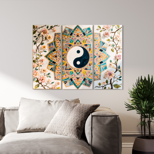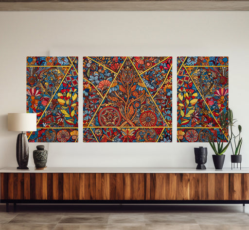 Barevný dřevěný obraz – 3-panelový obraz – Květinová geometrie🌸