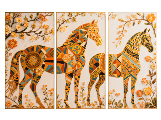 Zobrazit celý detailBarevný dřevěný obraz – 3dílný obraz – Zlatí koně