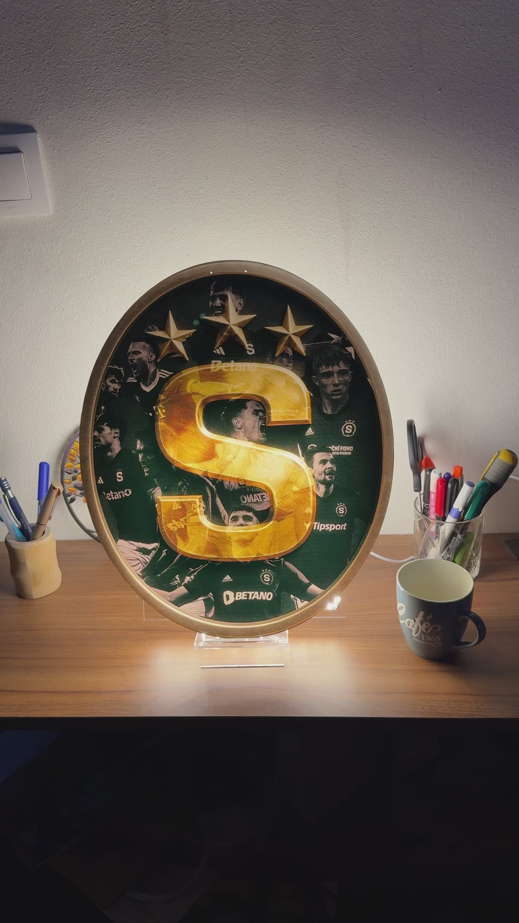 Dopřejte si jedinečný zážitek s touto stylovou stolní lampou, která potěší každého fanouška Sparty! Lampa stojí na elegantním podstavci a její dominantou je motiv klubového znaku s legendárními hráči Sparty v pozadí. Na výběr máte dvě velikosti – 33 × 33 cm nebo 24 × 24 cm, takže si můžete vybrat přesně podle svých potřeb.